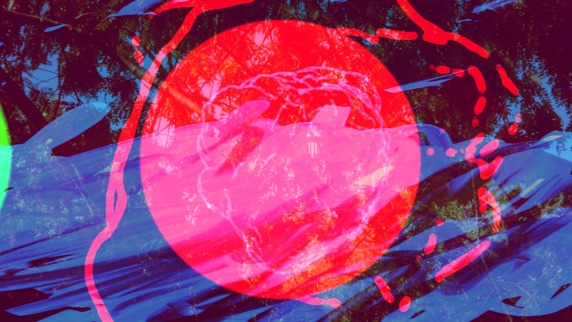 He straddles analogue and digital technologies, scoring visuals to a soundtrack that recalls the noisy rhythm of a slowed down film projector, here simulating the heightened sensations of a panic attack. At different points during the film the grading of the image separates into red, blue and green, a glitch used to different effect in the video’s epilogue as pink and blue frames flicker strobiscopically, imitating sight as if through eyelids closed tightly against bright sunlight. Drew points to a consciousness shared with the progress of technology where its ‘lossi-ness’ can be compared to our own.